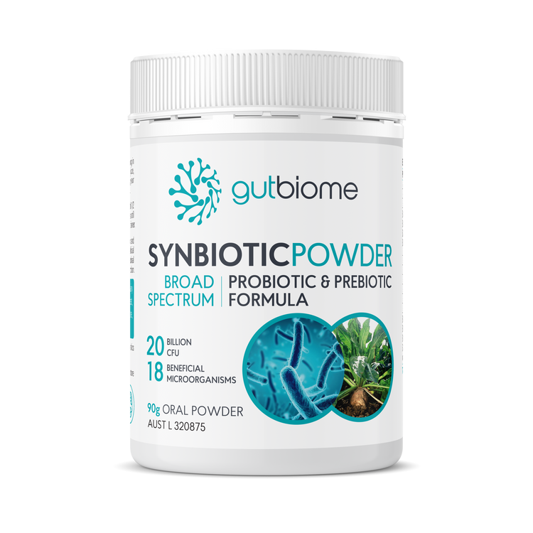 GutBiome Synbiotic Powder is a broad spectrum probiotic and prebiotic (Synbiotic) multi strain formula that includes 18 beneficial microorganisms including beneficial yeast to maintain gastrointestinal mucosal membrane health and support healthy immune system function. The synergistic nature of GutBiome Synbiotics provides the added benefits of both probiotics and prebiotics to optimise the healthy microorganisms to colonise larger areas of the GutBiome.
